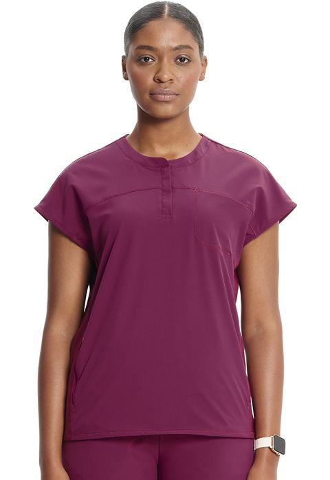 An updated Contemporary fit round neck top has a covered center front placket with a hidden zipper. There are three pockets: one in-seam zip chest pocket and two in-seam zip pockets with signature contrast mesh pocket bags. Other features include front and back curved yoke seams plus dyed-to-match rib-knit side and center back panels for fit and stretch. Cap sleeves finish the look. Center back length: 25 “